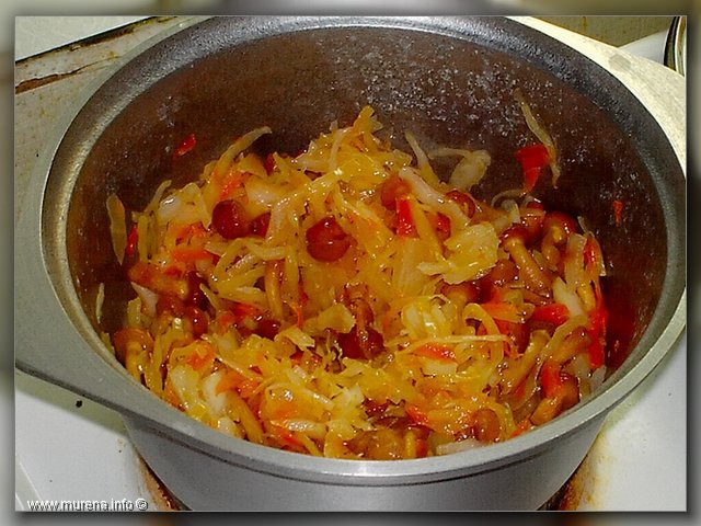 При желании ещё во время готовки можно добавить грудинку или сосиски.