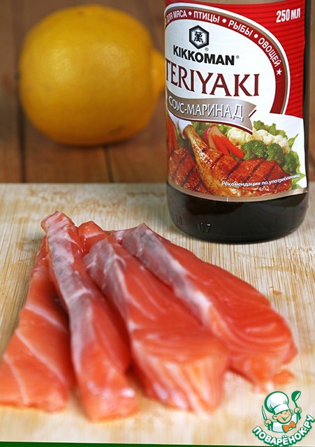 И так, приступим к приготовлению. Вначале поставим мариноваться ломтики лосося (небольшие, около 10 см длиной, средней толщины). Для этого зальем их 2 столовыми ложками Соуса-маринада Kikkoman Teriyaki и небольшим количеством лимонного сока.