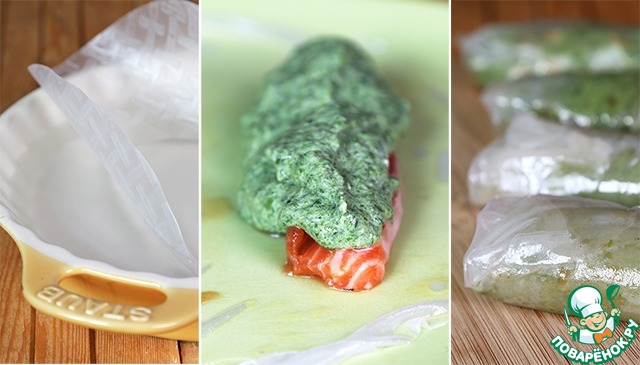Для меня общение с рисовой бумагой оказалось не очень простым) Плюс сложность из-за мягкой начинки. Если Вы не хотите рисковать, можете обернуть только лосось, или лосось с очень небольшим количеством шпинатного мусса, и подать его отдельно.