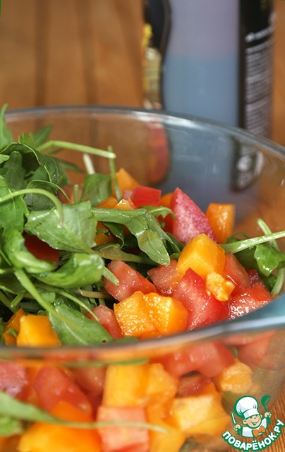 Перед жаркой быстренько нарезаем какой-нибудь свежий салат. У меня это руккола с двумя сортами помидоров и оливковым маслом. По желанию можно добавить бальзамический уксус или крем.