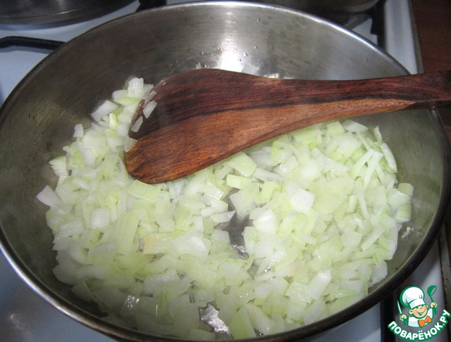 Лук нарезать кубиками и обжарить на растительном масле 2-3 минуты.