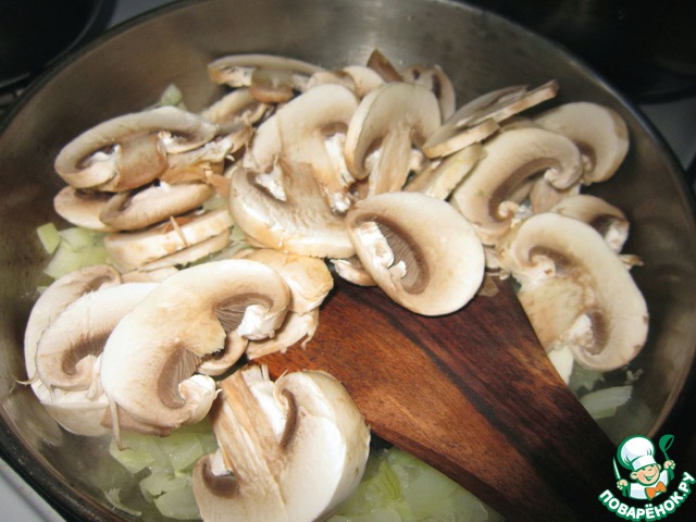 Грибы нарезать тонкими пластинами и добавить к луку. Посолить, поперчить. Жарить 5-7 минут.