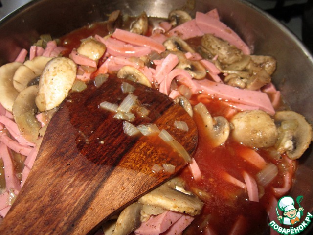 Ветчину нарезать соломкой и выложить на сковородку, где жарятся лук и грибы. Добавить томатное пюре и 2/3 стакана горячей воды, тушить еще 5 минут.