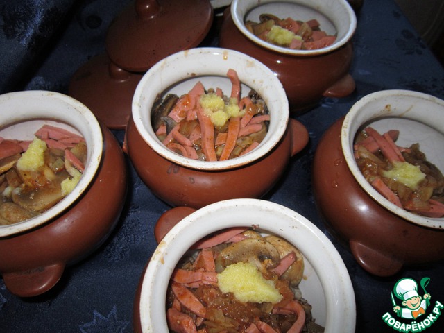 Гречневую кашу выложить в порционные горшочки. Сверху положить обжаренную смесь и кусочек сливочного масла.
