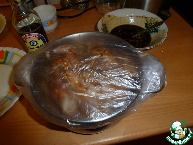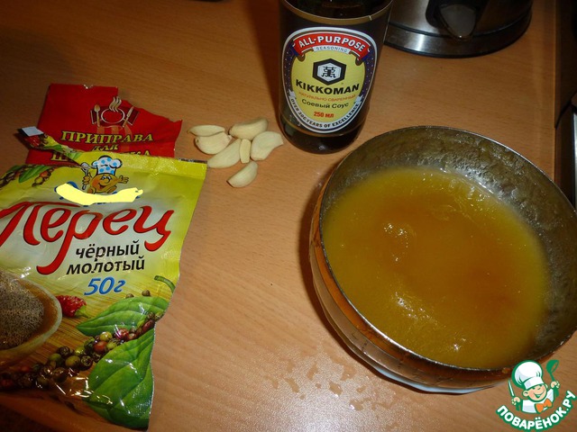 Готовим соус: смешиваем мед, соевый соус, мелко нарезанный чеснок, перец, приправу.