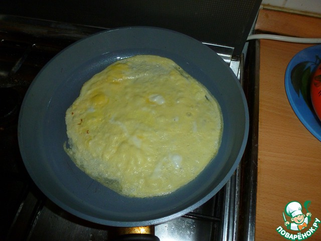 На сковороде с растительным маслом из слегка взбитых яиц готовим омлет. Желательно, чтоб он был потоньше (у меня 4 яиц хватает на 2 большие сковородки).