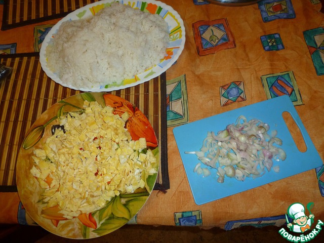 Отвариваем рис в подсоленной воде. Мелко нарезаем омлет и лук-шалот.