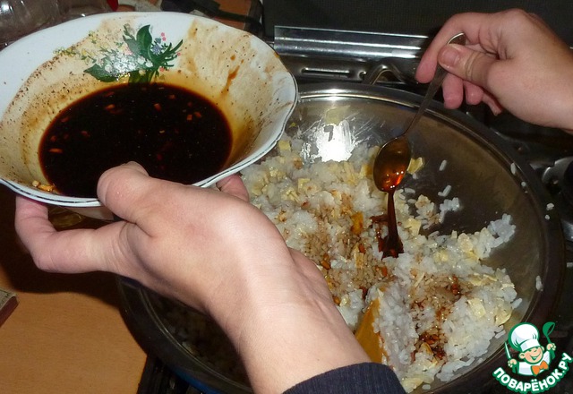 В глубокой сковороде (воке, казане) слегка обжариваем лук-шалот, добавляем омлет, рис и 1/3 оставшегося соуса (можно меньше, на свой вкус). Обжариваем, помешивая, 3-5 минут.