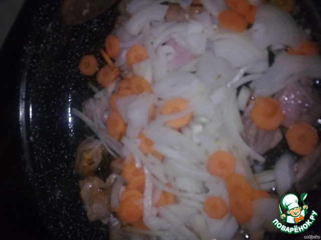 Добавить нарезанный лук и морковь, обжарить все вместе