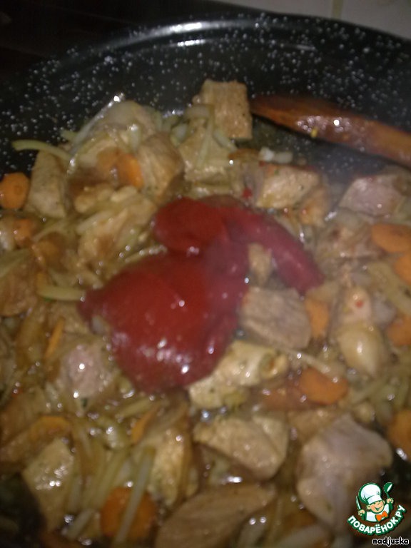 Когда все будет хорошо обжарено, добавить 1-2 ст.л. томатной пасты
