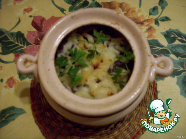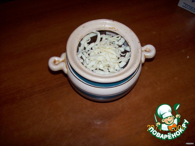 Поставить горшочки в холодную духовку, запекать 35 минут при 150 градусах. За 5 минут до готовности снять крышечки, включить духовку на 200 градусов, подрумянить.