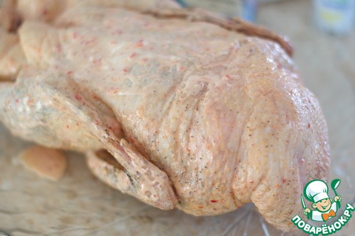 Уточку натираем солью и обмазываем маринадом, оставляем промариноваться 6-12 часов в холодильнике.
