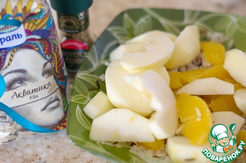 Яблоко очищаем, режем дольками и добавляем с апельсином к остывшему рису.