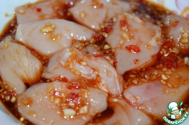 Куриное филе порезать на кусочки. Чеснок, имбирь и перец чили измельчить (лучше в блендере), добавить сахарную пудру и соевый соус, хорошо перемешать. Залить маринадом кусочки куриного филе и оставить на 30 минут.