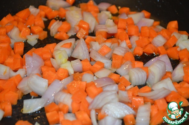 Лек и морковь порезать кубиком и обжаривать помешавая на хоорошо разогретом масле.