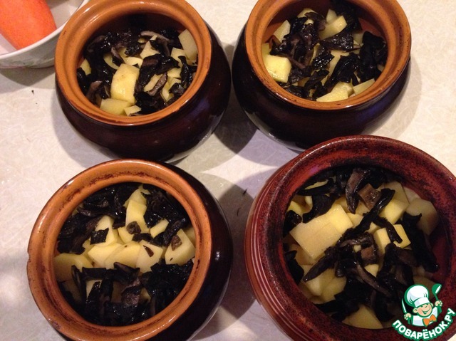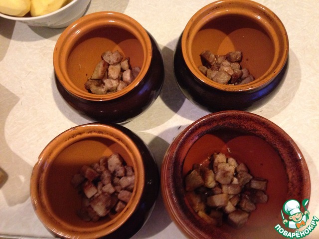 Режем мясо на кубики, обжариваем на растительном масле и раскладываем по горшочкам