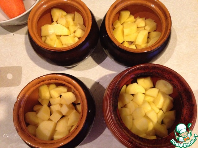 Следующий слой -картофель. Тоже режем кубиками и раскладываем по горшочкам. Примерно по 2 штуки на горшочек.