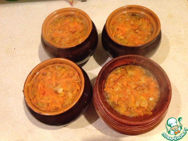 Далее делаем зажарку с луком и морковью, кладем последним слоем. Все это солим по вкусу и заливаем кипятком