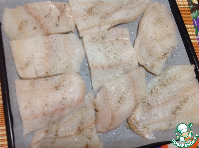 Куски рыбы выложить на противень. Посолить, поперчить по вкусу.