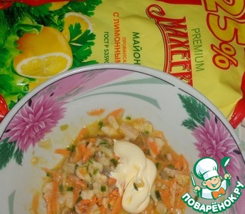 Рыбное филе порезать на небольшие кусочки. Смешать рыбу с морковью, яйцом, майонезом, солью и измельченным чесноком.