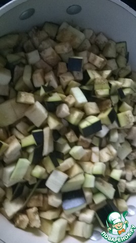 Готовим баклажаны: берем три небольших или два больших баклажана. Режим на мелкие кубики. Наливаем в сковороду растительное масло, добавляем зубчик чеснока, порезанный на "лепестки" и прогреваем в масле, но не жарим. Добавляем баклажаны. Тушим до готовности, подливая воды либо бульона. Солим, перчим по вкусу. Начинка готова. Даем ей остыть.