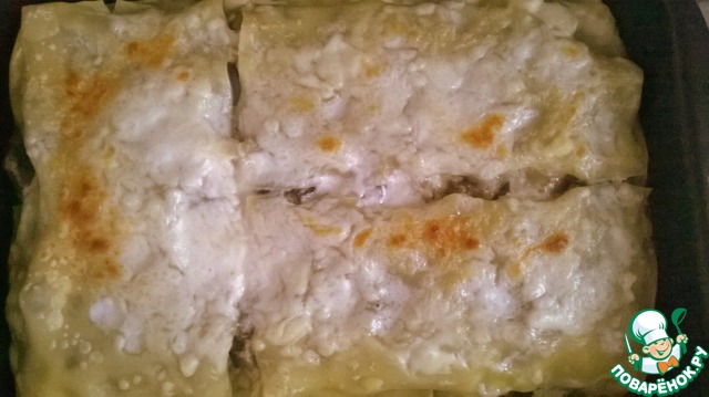 Завершающим слоем будут листы лазаньи политые соусом и присыпанные сыром. Накрываем форму фольгой и отправляем в холодильник "на пропитку", в моем случае до следующего дня.