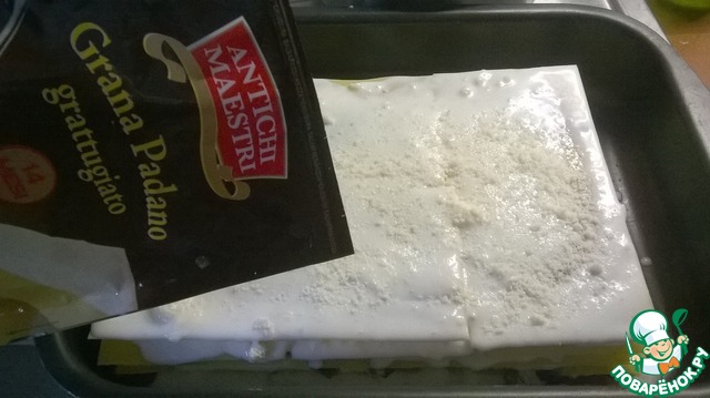Дно формы для запекания смазываем слегка соусом, укладываем листы лазаньи, поливаем их соусом, выкладываем начинку, присыпаем тертым сыром. Все повторяем снова. Будет 3-4 слоя. Сыр, как я и писала, Вы можете взять любой соленновато-острый. У кого есть возможность возьмите Пармезан, Пекорино или, как я, Грана Падано.