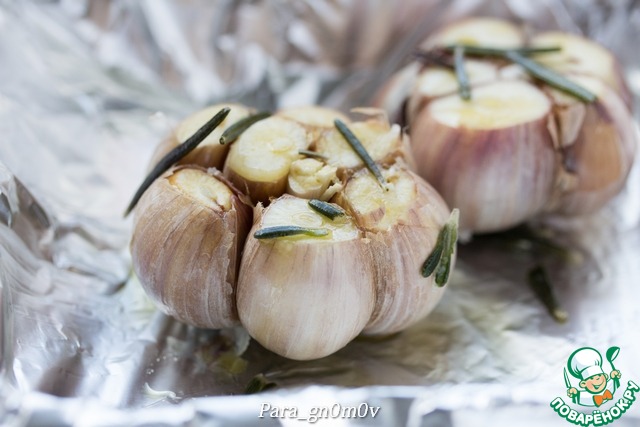 1. Для начала займемся печеным чесноком. Головку чеснока очистить от верхней шелухи и срезать верхушку зубчиков примерно на 1\4 (срезанную часть не выбрасывать!), сохраняя целостность головки. Смешать оливковое масло, розмарин и соль и полить равномерно этой смесью чеснок. Выложить чеснок на фольгу, плотно закрыть и запекать в предварительно разогретой до 180 градусов духовке 30 минут. Чесночная масса должна хорошо пропечься и стать мягкой. Я запекала две головки, потому что такая масса прекрасно подходит для бутербродов, но для нашего ризотто понадобится только одна головка.