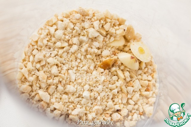 3. Обжаренные орехи и оставшиеся при обрезке зубчики чеснока измельчить блендером в крупную крошку.