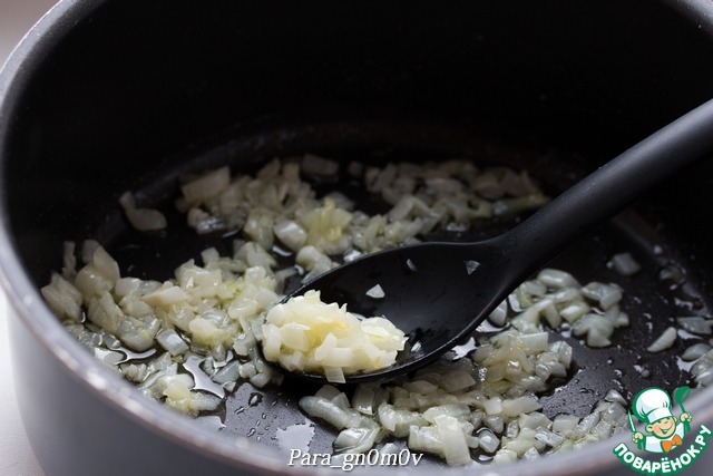8. В кастрюле или в глубокой сковороде растопить сливочное масло. Лук нарезать кубиками и обжарить пару минут в сливочном масле.