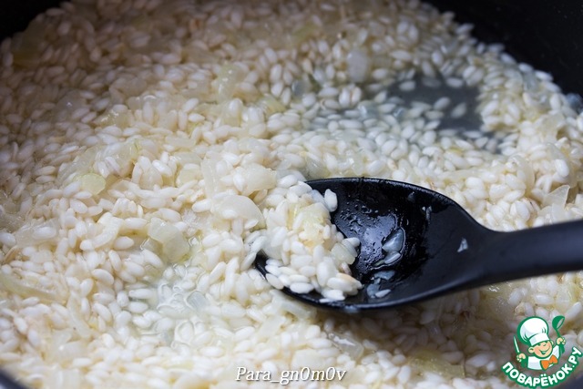 7. Теперь, собственно, само ризотто. Главное в ризотто - это правильный рис. Ризотто не должно быть рассыпчатым, но рисинки должны остаться целыми, не развариться в кашу. Если рис выбран правильно, то выполнить это условие не составляет труда. Рис "Арборио" от Мистраль прекрасно подходит для этой цели. Жаль, что редко бывает в наших магазинах.