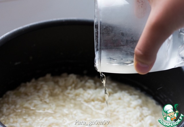 9. Добавить сухой рис и обжаривать в масле минут пять, пока рис не пропитается маслом и не станет прозрачным по краям. Влить одну поварешку горячего бульона и варить, помешивая, до полного впитывания бульона. По мере впитывания подливать бульон небольшими порциями.