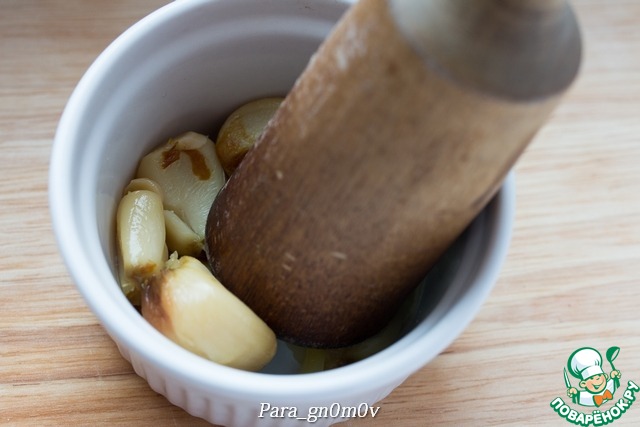 11. Печеный чеснок очистить от шелухи и раздавить с помощью толкушки или тупой стороны ножа в пюреобразную массу. Минут за 5 до окончания добавить в ризотто чесночное пюре и тщательно размешать.