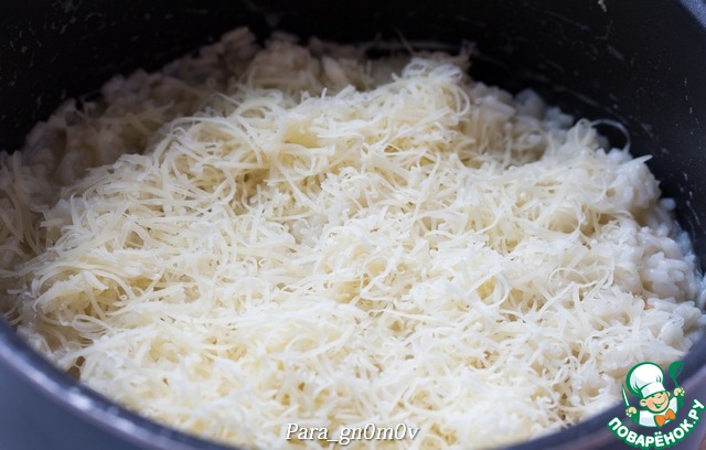12. В конце следует вливать бульон очень осторожно, небольшими порциями, чтобы достичь нужной консистенции. Когда ризотто будет готово, всыпать тертый пармезан и перемешать. Выправить на соль.