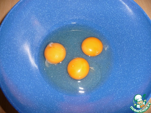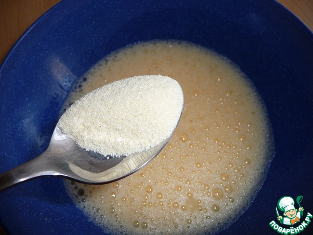 Яйца взбить в крепкую пену, добавить крупу манную, перемешать. Оставить минут на 20, чтобы манка набухла.