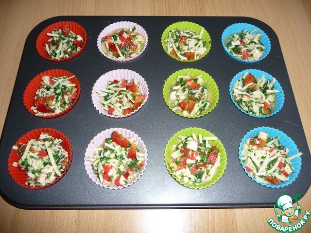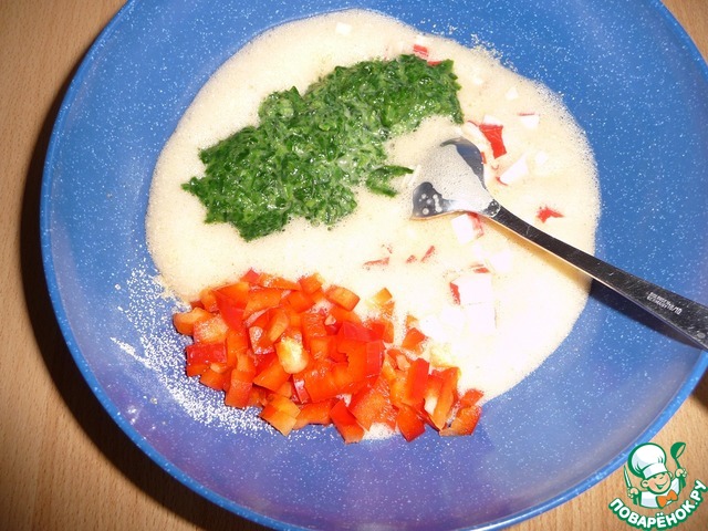 В миску с яйцами и крупой манной добавить нарезанные продукты и шпинат, перемешать.