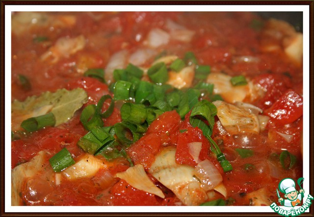 3. Потом добавляем помидоры и их сок, перемешиваем.