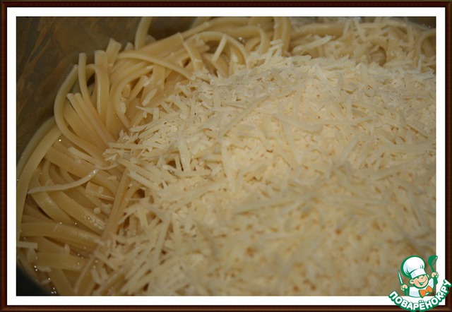 7. Пока всё у нас готовится, сварить макароны по указанию на упаковке. Слить воду, оставив 1/4 стакана воды, в которой варились макароны. Соединить макароны, 1/4 стакана воды и пармезан, хорошо перемешать.
