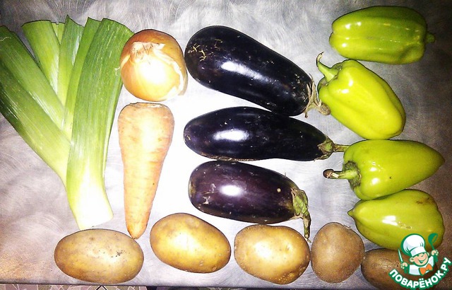 т. е. моем и нарезаем всё мелко, баклажаны - кружками, перец - на 4 части, картофель - кубиками.