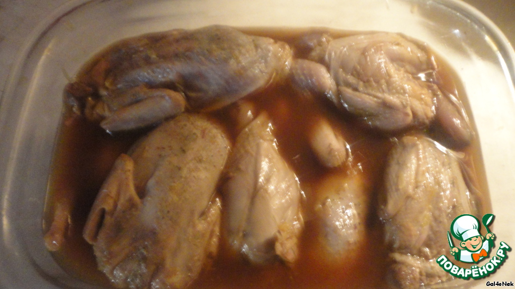 Смешать сок половины апельсина и лимона с вином и соевым соусом. Этим маринадом залить перепела на ночь.