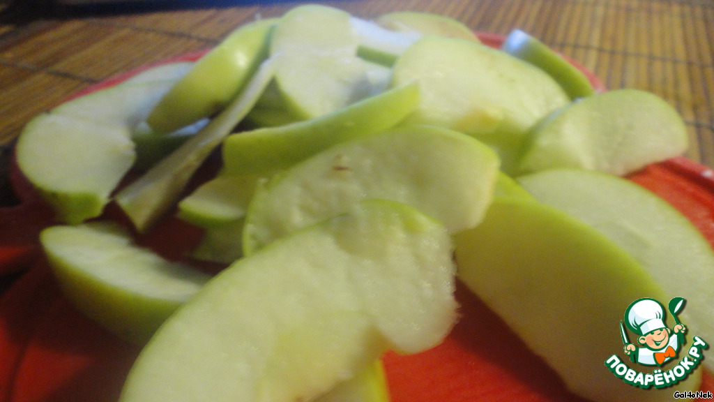 Т.к. перепела пташки маленькие и запекаются быстро, то яблочко режем достаточно тонко - на 16 кусочков.