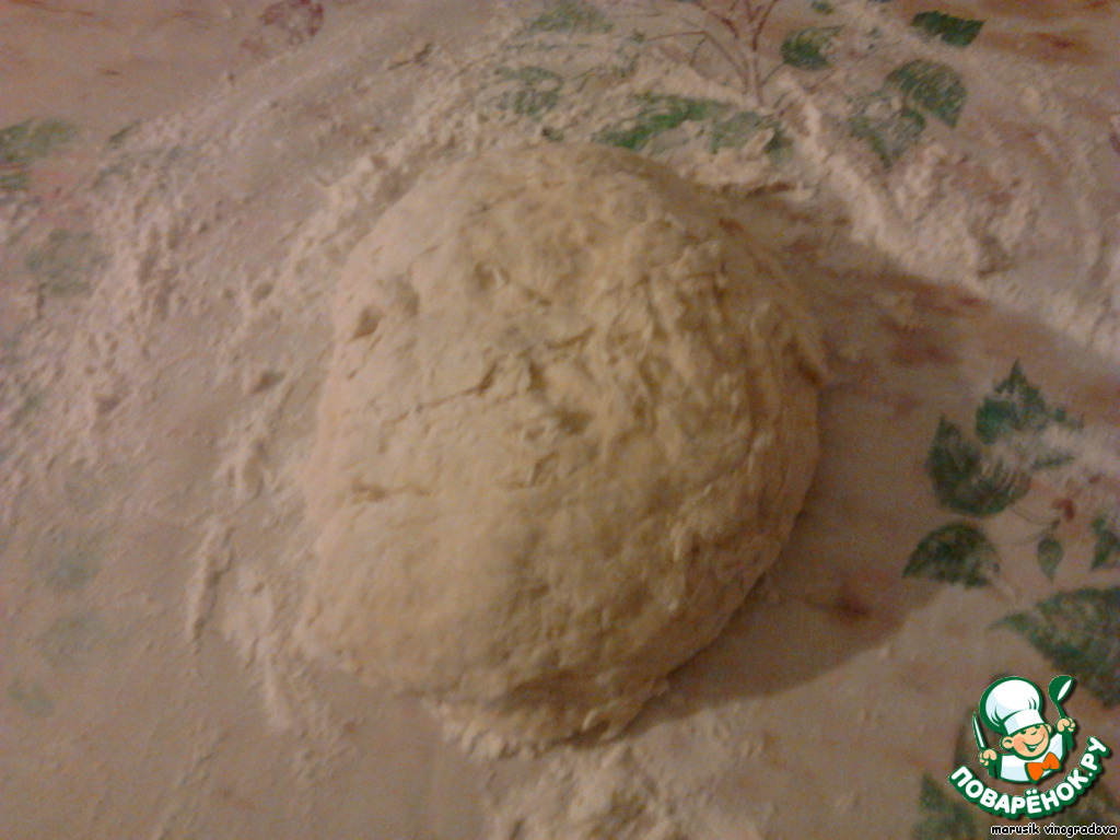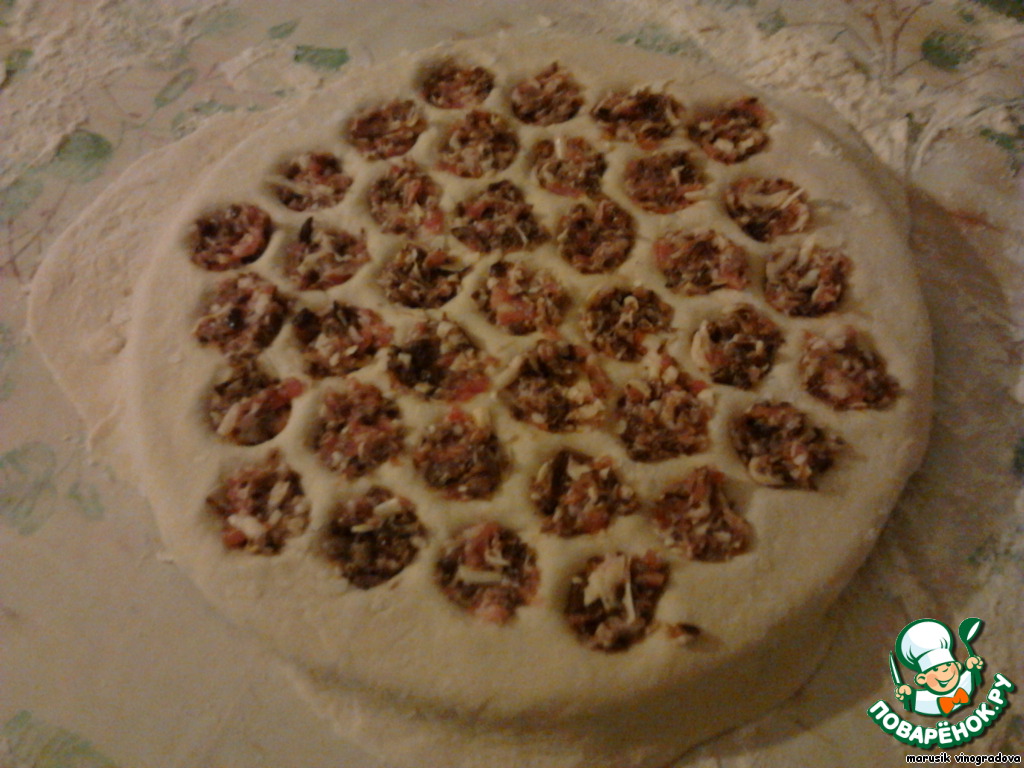 Отрезаем кусок теста, раскатываем, кладем раскатанный пласт теста на пельменницу, начиняем начинкой; раскатываем второй пласт, накрываем сверху, раскатываем скалкой.