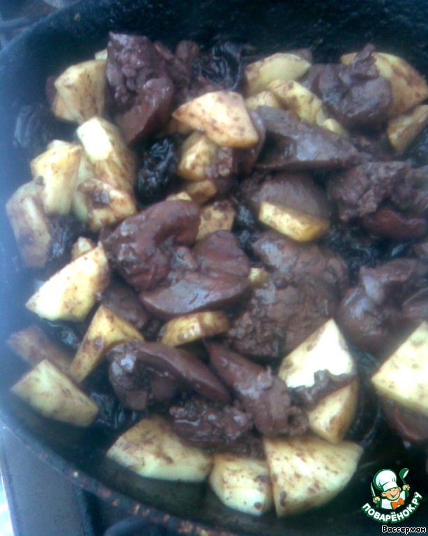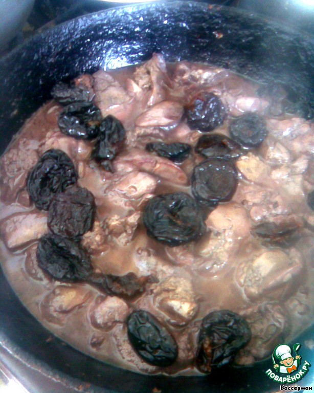 Когда печень хорошо прогреется, добавим вино, нарезанный полукольцами лук, чернослив, убавим огонь до маленького, накроем крышкой и протушим.