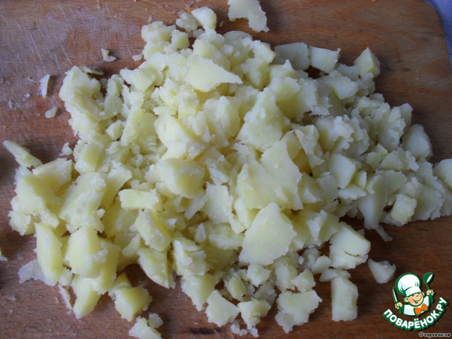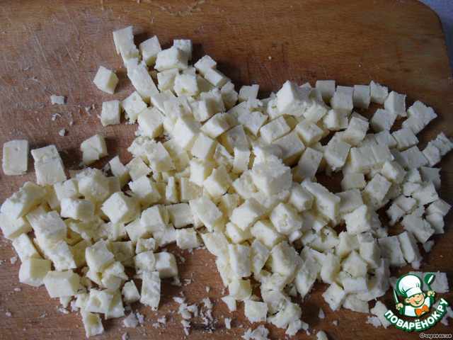 Брынзу нарезать кубиком и смешать с овощами, поперчить.
