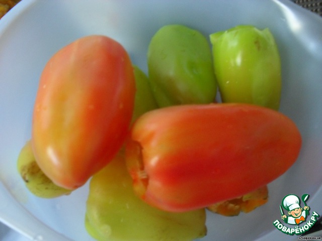 Перцы фаршируем начинкой, укладываем в глубокий противень, сверху засыпаем помидоры, заливаем водой, добавляем специи, соль и перец, и запекаем в духовке до готовности.