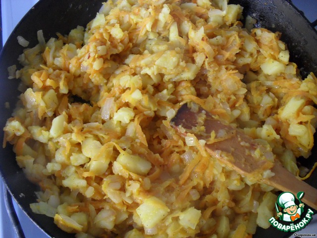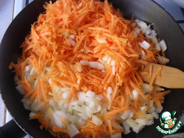 Лук нарезать кубиком, морковь натереть на терке и обжарить.