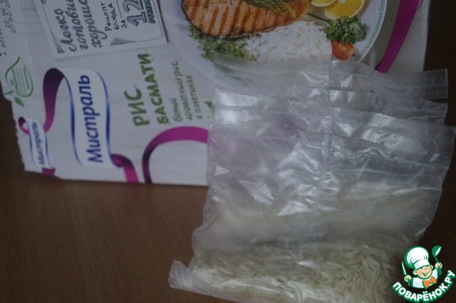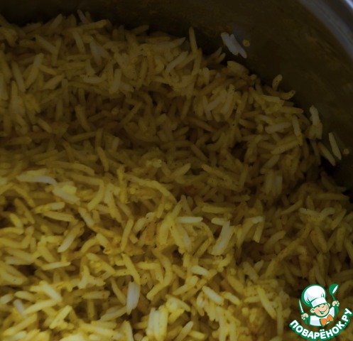 Рис вынуть из пакетиков и поместить в глубокую чашу или кастрюлю, добавить куркуму и растительное масло, посолить и перемешать. Рис получится красивого желтого цвета. В идеале необходим шафран, но к сожалению его у нас не нашлось. Поэтому если вы будете готовить и он у вас есть, то используйте его.