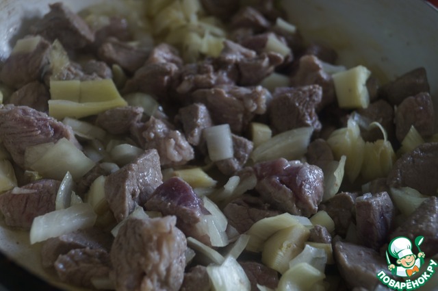 Теперь займемся мясом. Баранину промываем, обсушим бумажным полотенцем и режем на небольшие кусочки. Мелко режем лук. В сковороде растапливаем сливочное масло и обжариваем мясо, затем кладем лук и снова обжариваем около 7 минут. Затем солим, перчим и снимаем с огня.