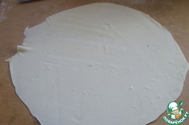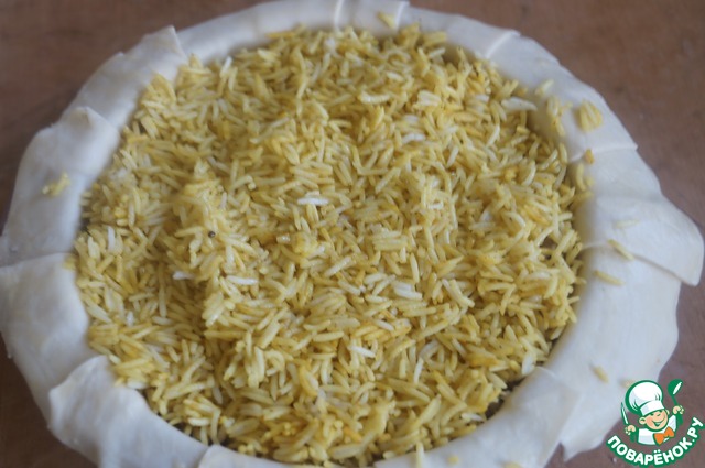 После того как рис и мясная начинка готовы, приступаем к раскатке теста. Пласт слоеного теста раскатываем очень тонко в круг, лишнее обрезаем, это нам пригодится для крышечки.