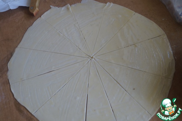 Круг из теста режем на 12 равных частей, как указано на фото. Смазываем обильно растопленным сливочным маслом. Масло лучше растопить на водяной бане.